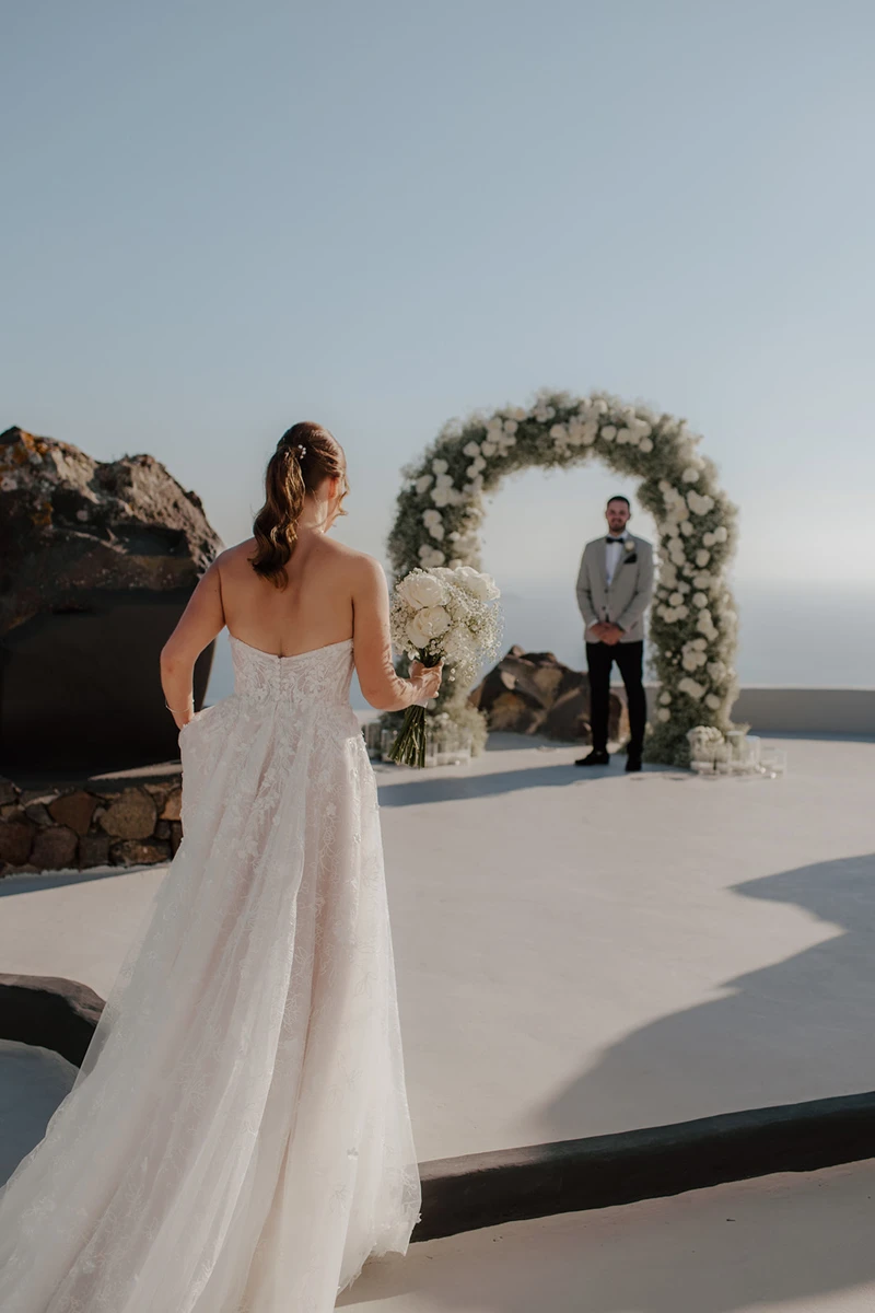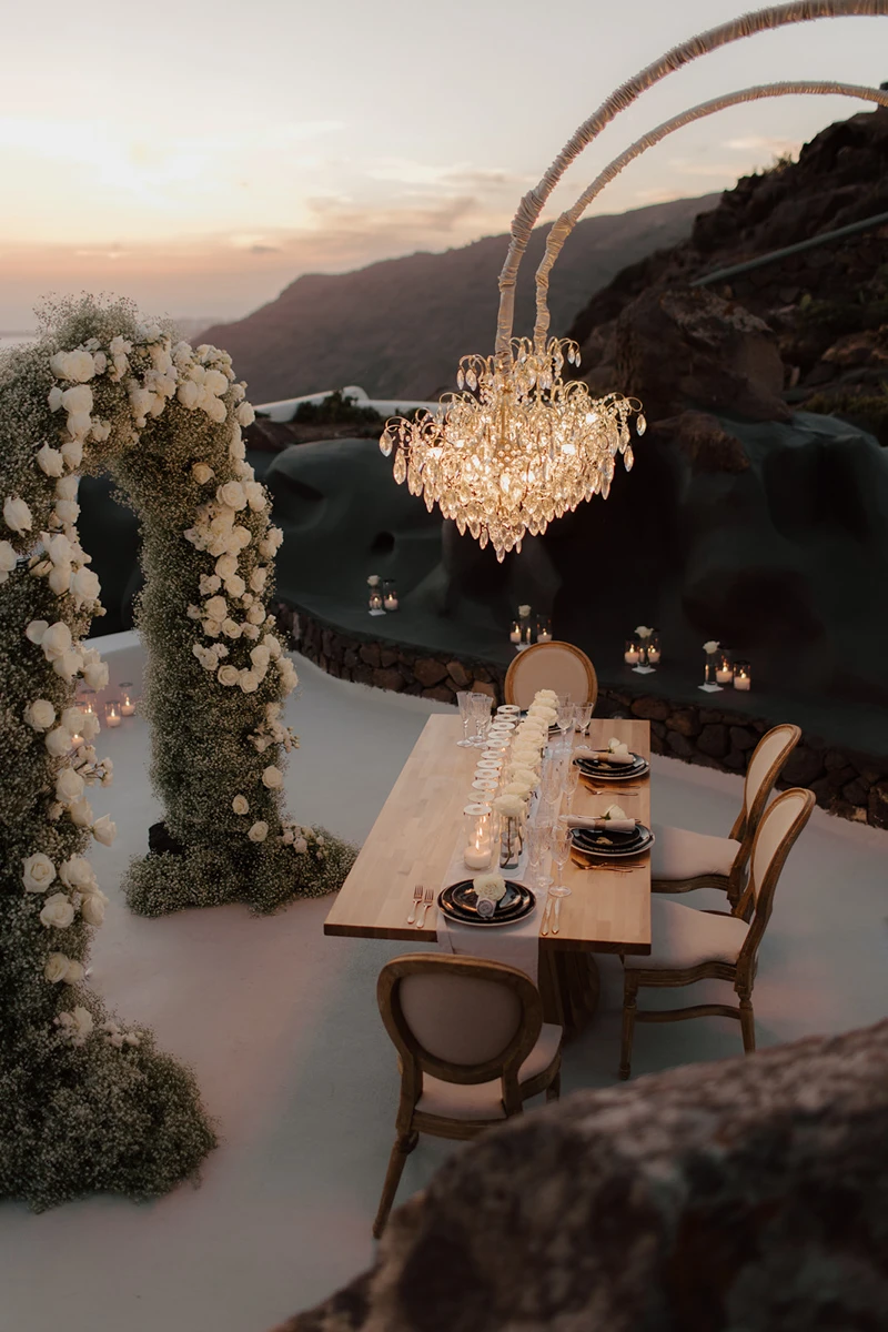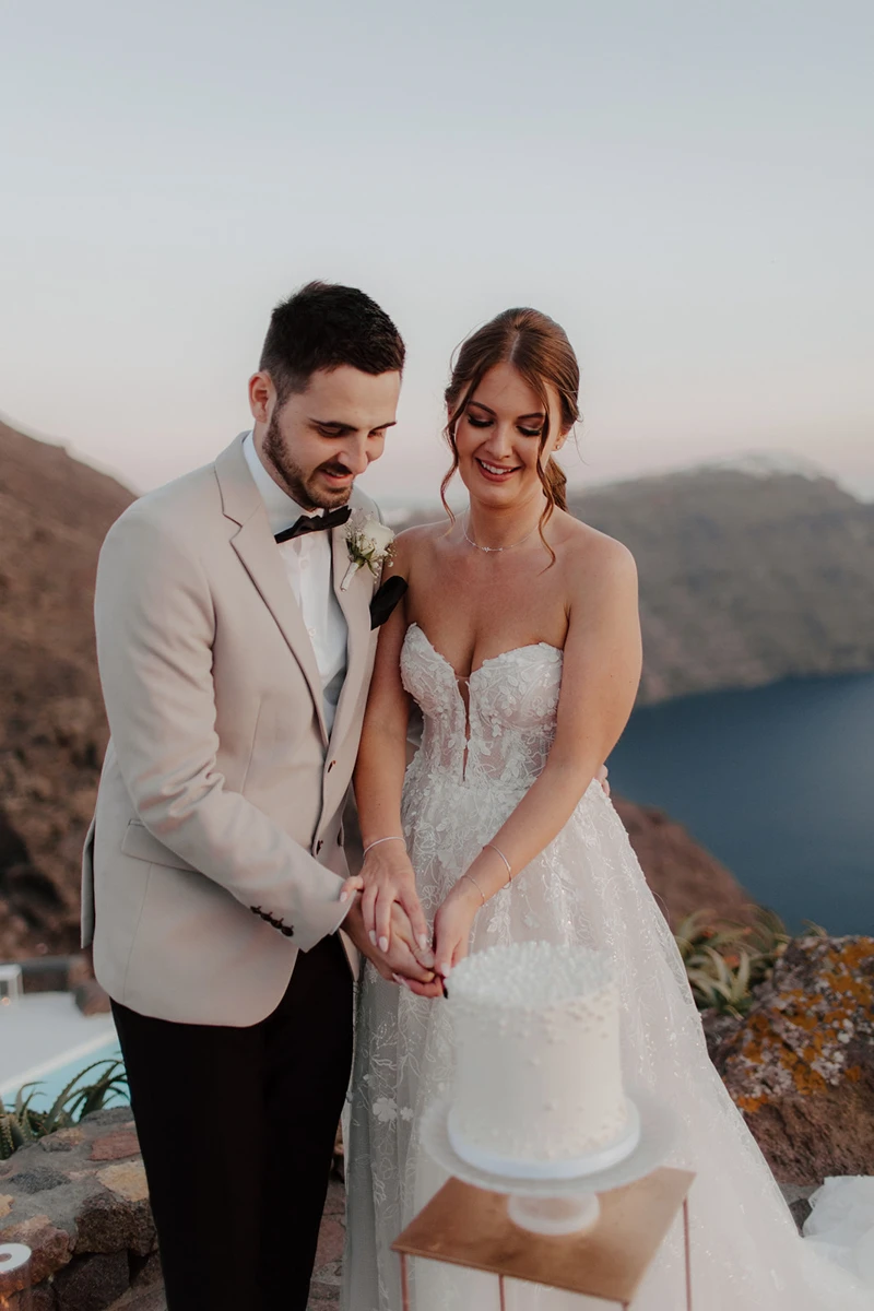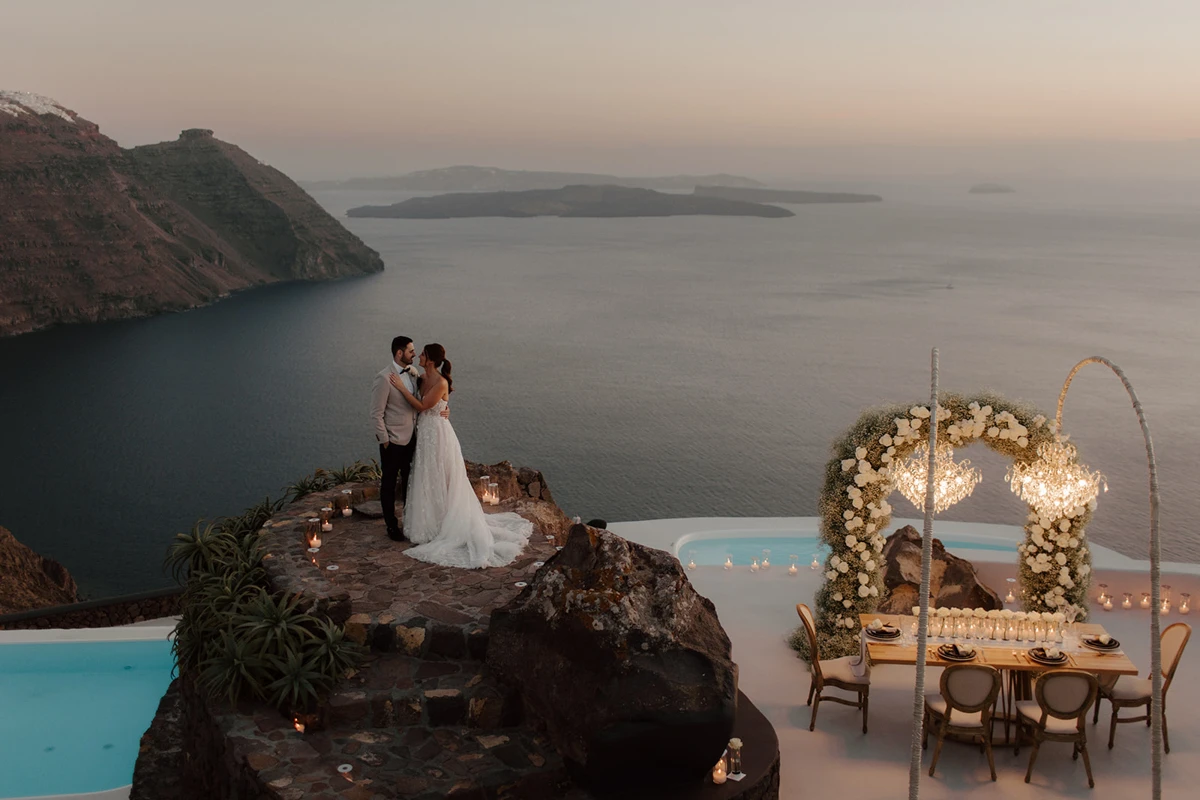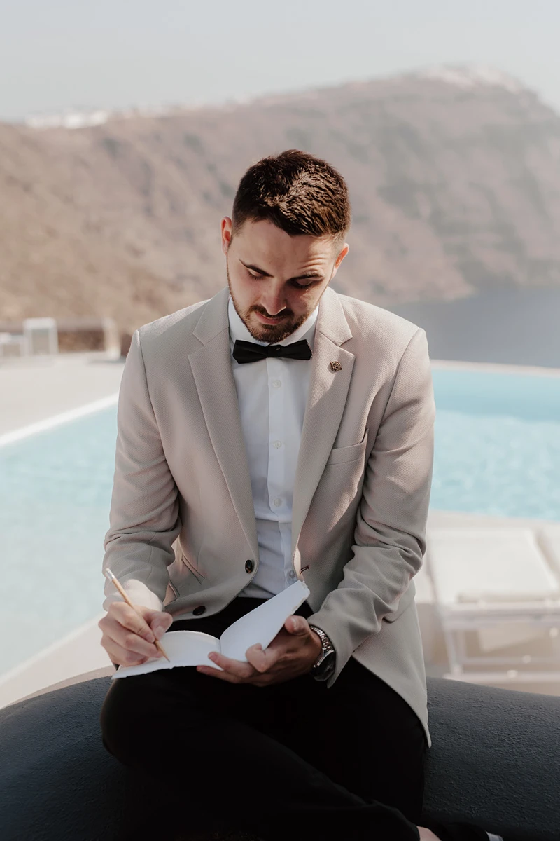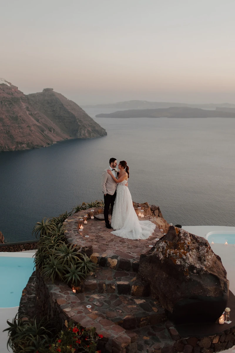 Levi and Aaron chose to celebrate their love with an intimate wedding, surrounded only by their parents. The entire day, from preparations to the ceremony and dinner, took place at the beautiful Aenaon Villas, with their photographer traveling all the way from the UK to capture every precious moment—including a breathtaking sunrise session on the caldera cliffs.