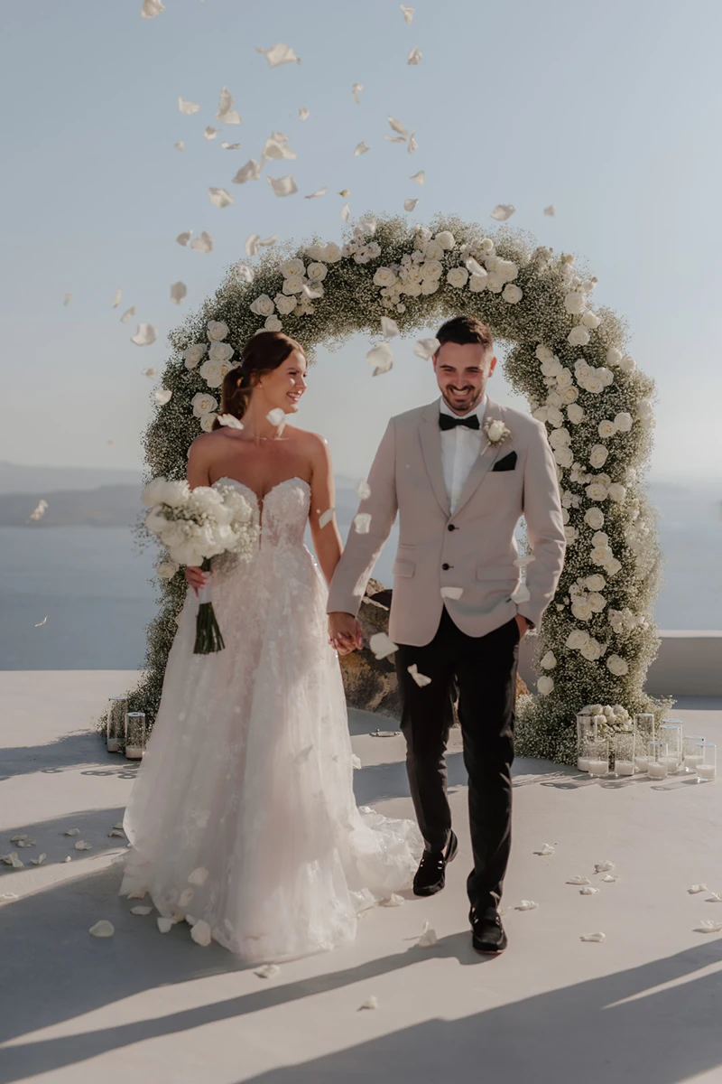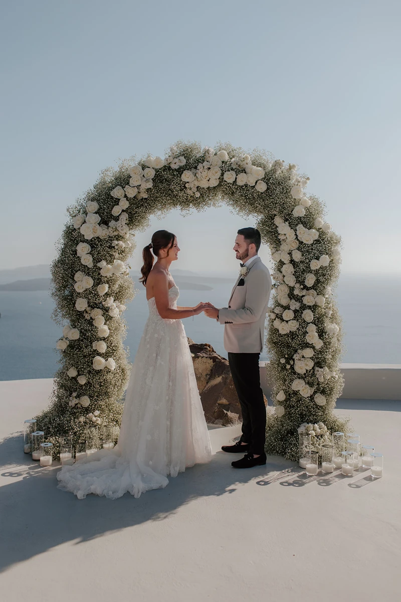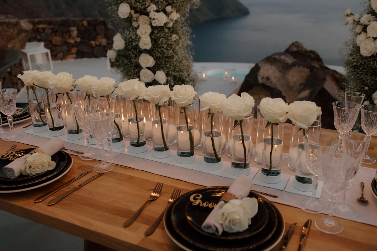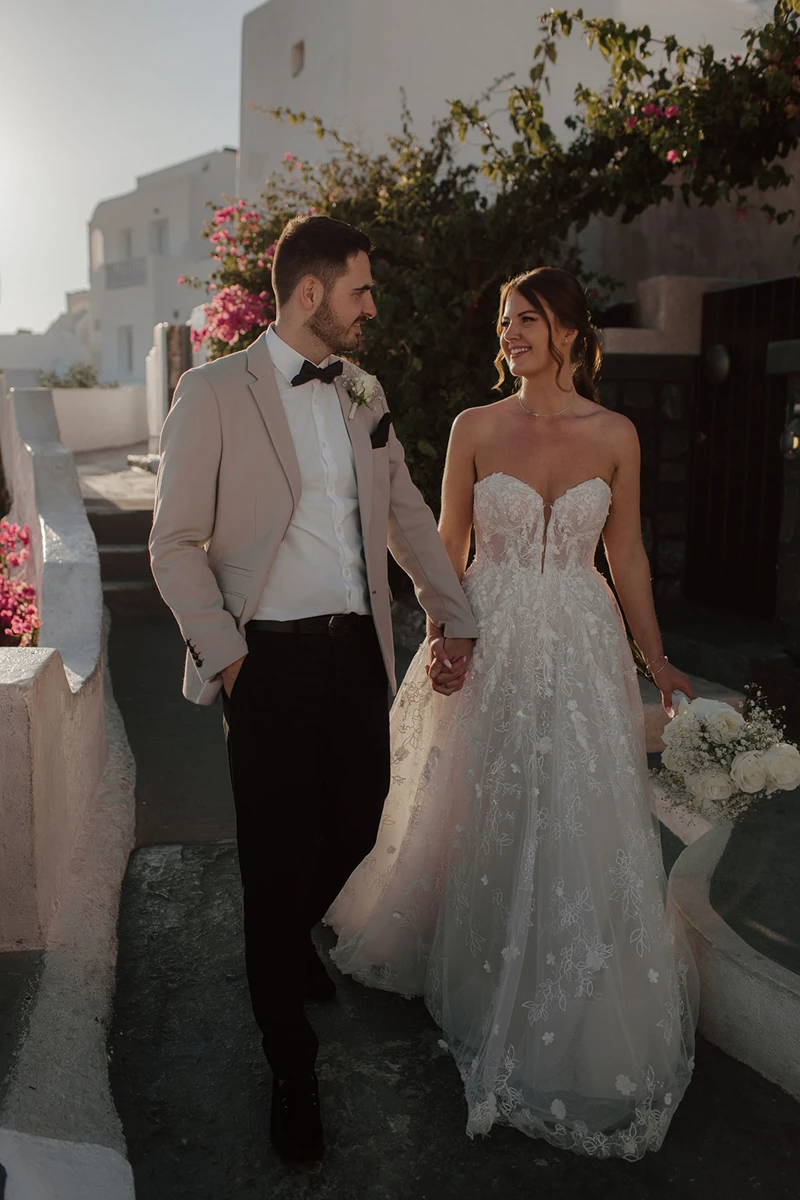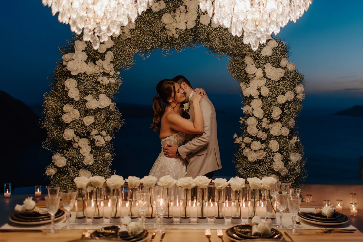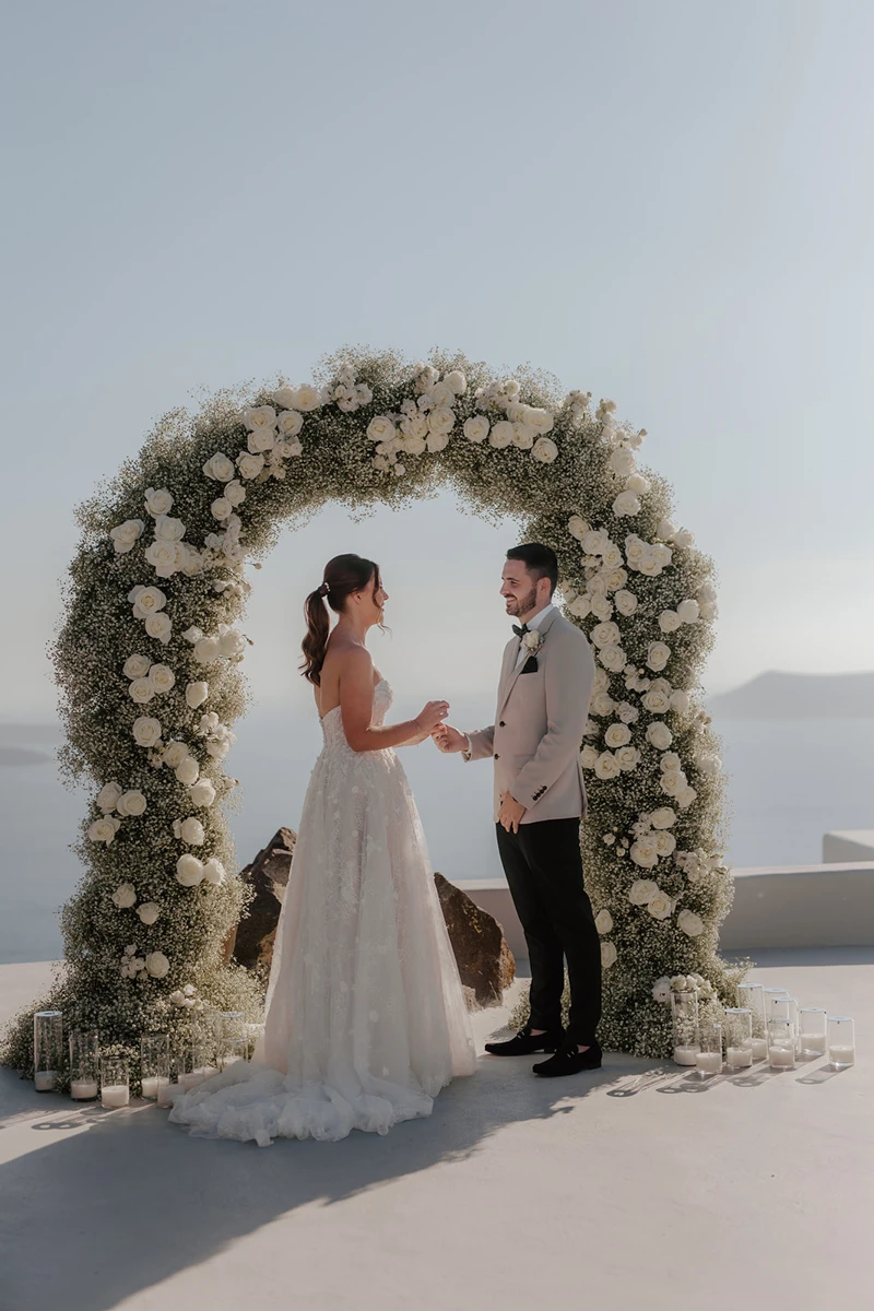 Levi and Aaron chose to celebrate their love with an intimate wedding, surrounded only by their parents. The entire day, from preparations to the ceremony and dinner, took place at the beautiful Aenaon Villas, with their photographer traveling all the way from the UK to capture every precious moment—including a breathtaking sunrise session on the caldera cliffs.