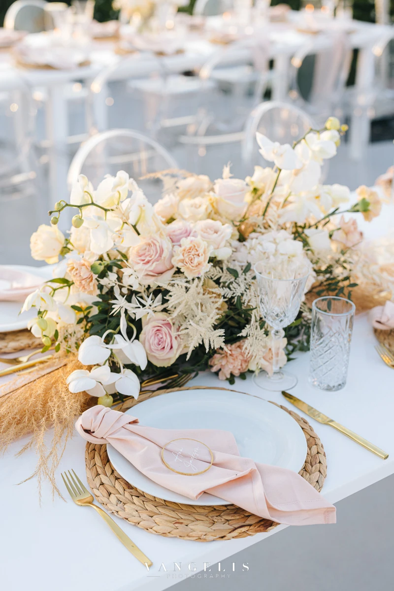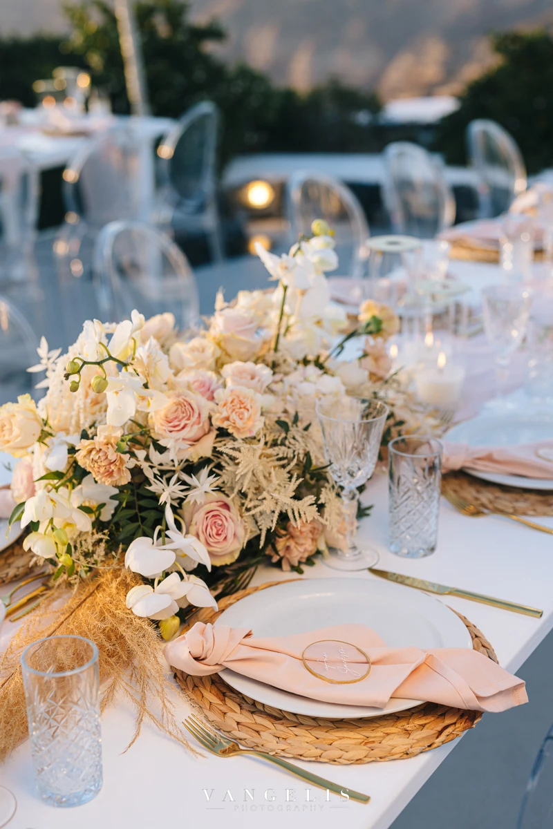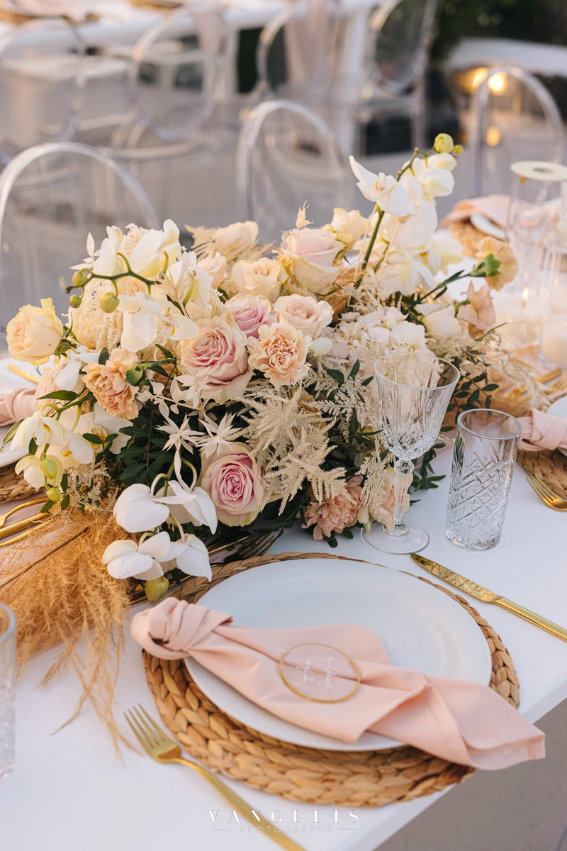 Meanwhile, we set up their wedding dinner tables, reflecting their clean, sophisticated, and minimal style. White tables with transparent chairs created an effortlessly chic look, while earthy-toned floral arrangements added warmth and harmony to the natural landscape. The crystal chandeliers elevated the scene with a touch of luxury that the occasion deserved.