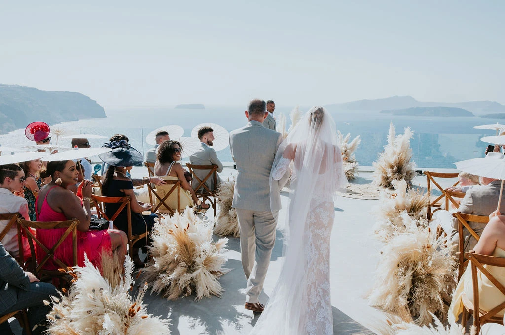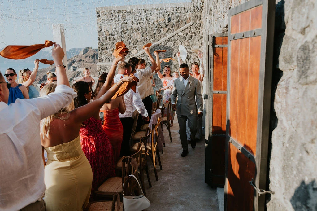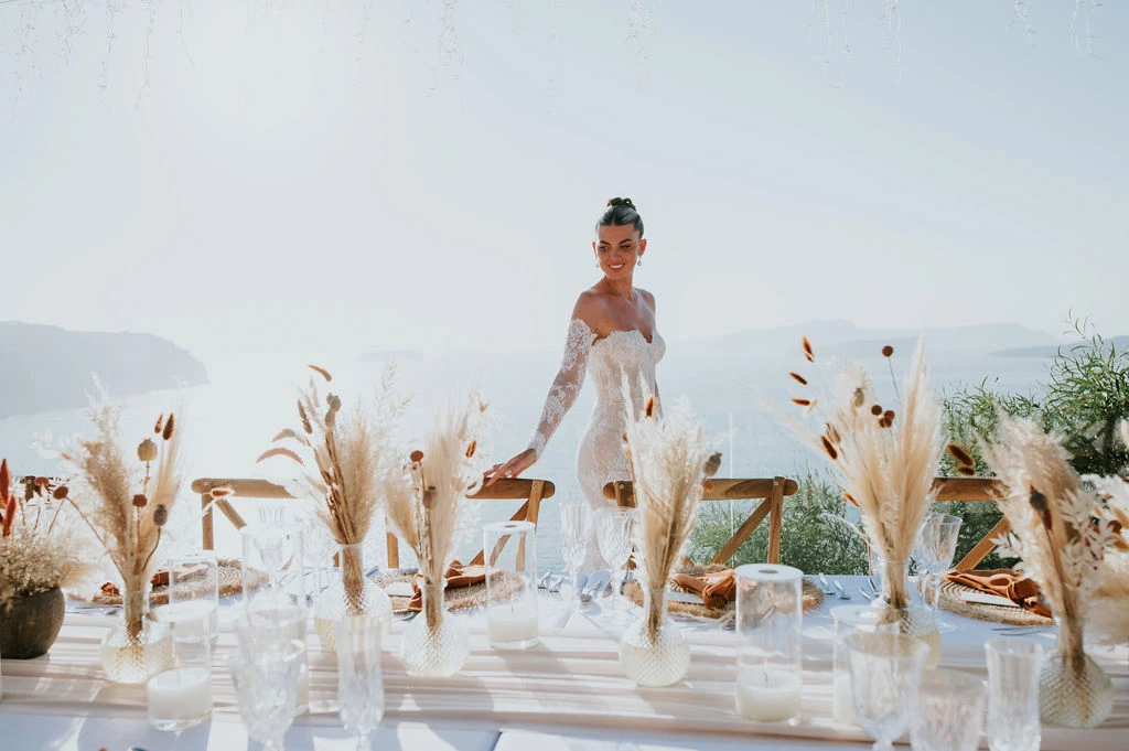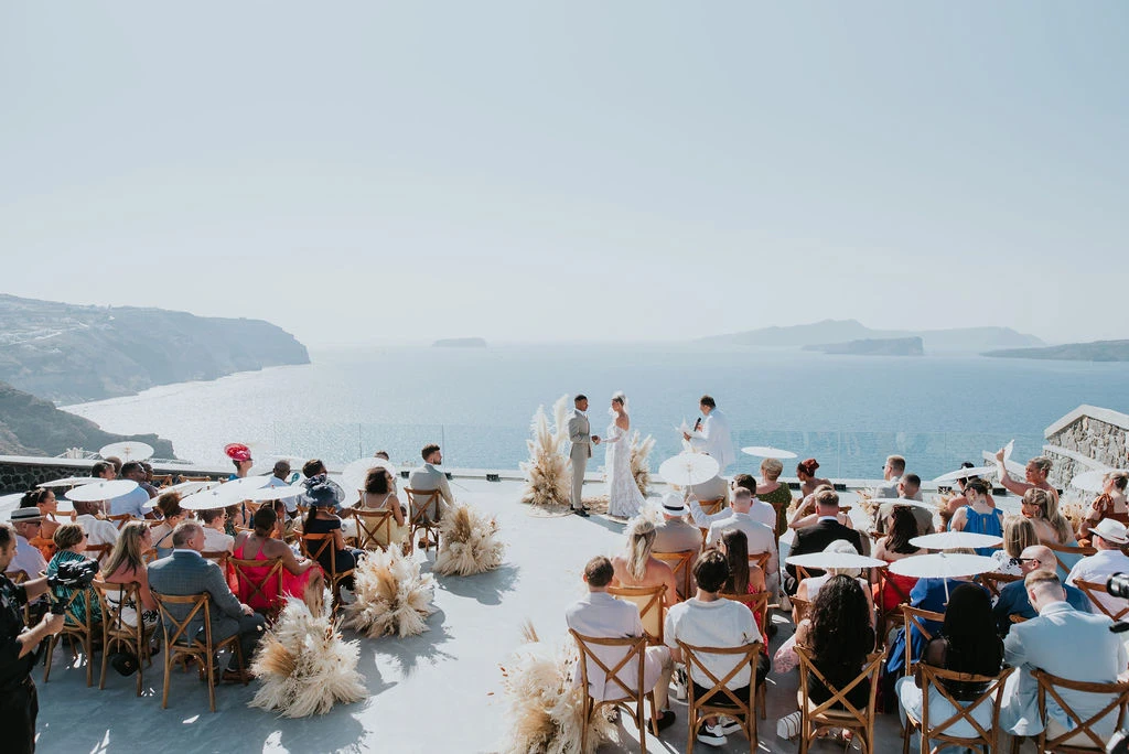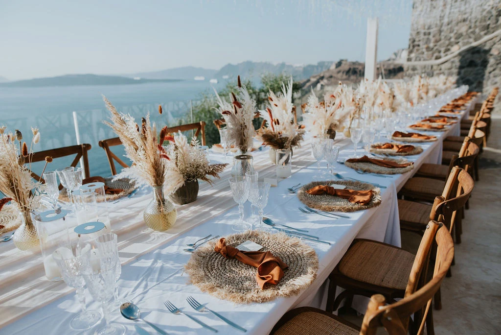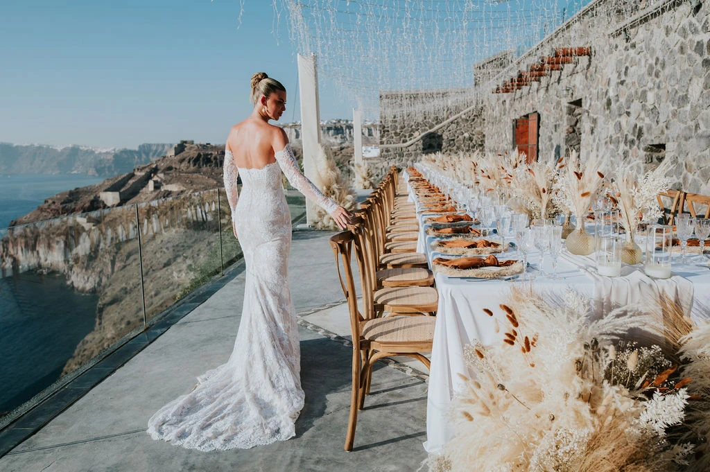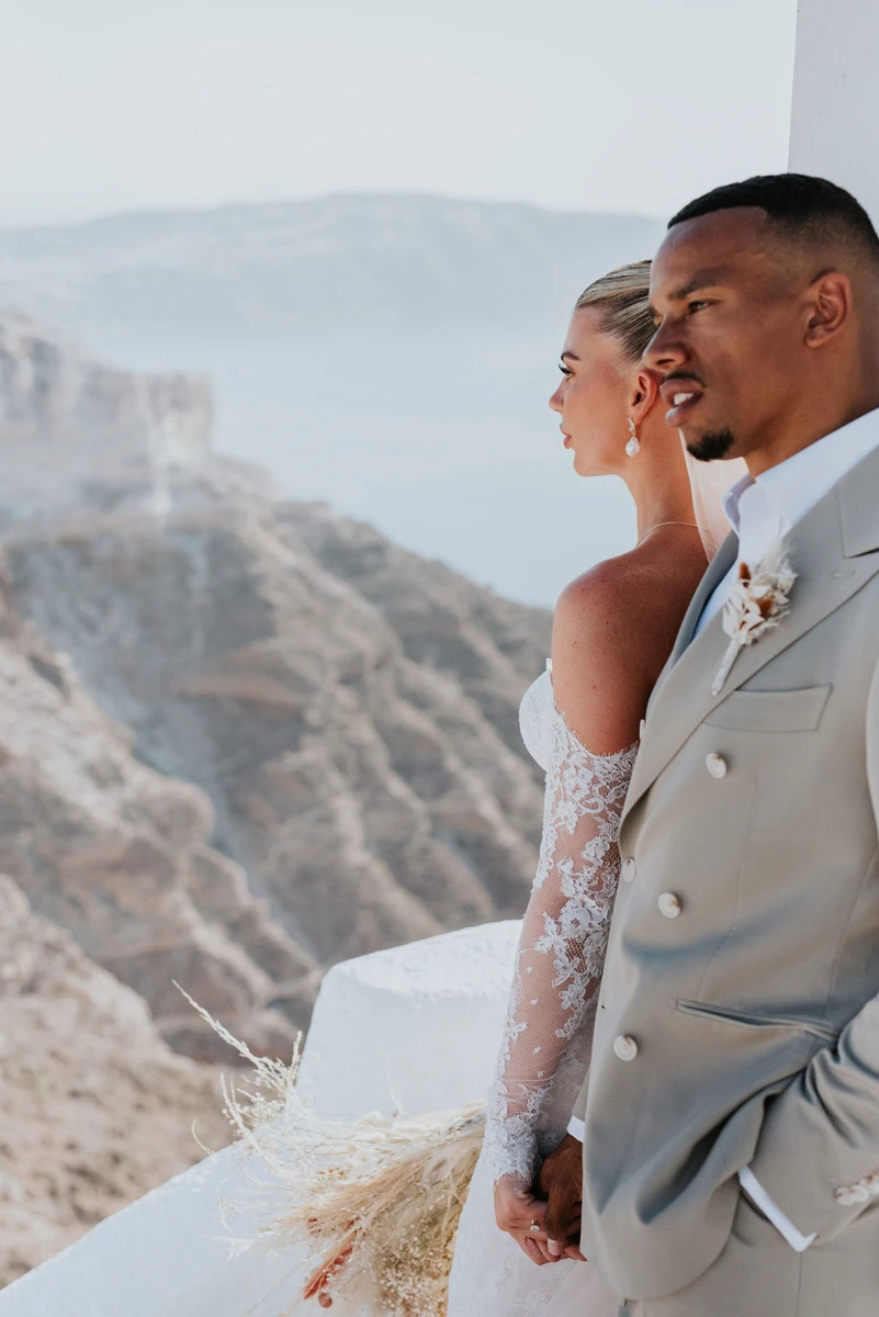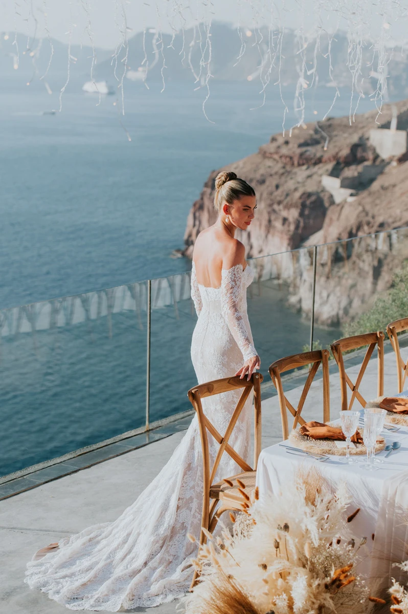 Their wedding took place on the stunning caldera cliff at Cavo Ventus, a venue that perfectly reflected their style and vision. Molly’s dream of a terracotta-themed wedding came to life beautifully, blending seamlessly with the natural elegance of the venue.