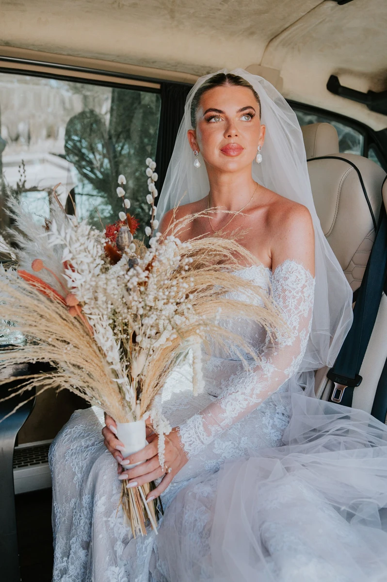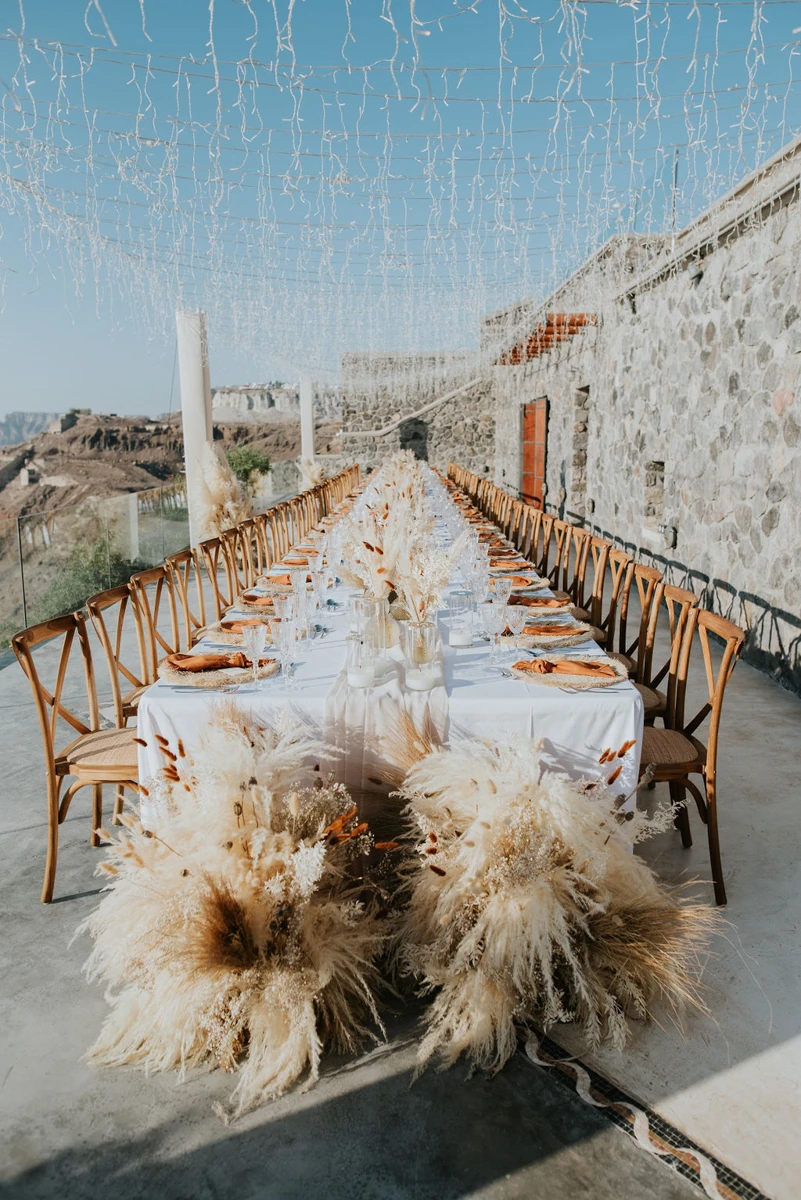 Molly envisioned a day adorned entirely with dried flowers, complemented by terracotta accents. Her ceremony featured stunning floral arrangements that matched the cross-back chairs for their 60 guests. For the wedding dinner, we curated an elegant table design with custom terracotta napkins, raffia place mats, and delicate vases filled with dried flowers—all perfectly aligned with her timeless style. A personalized welcome sign in terracotta hues added a warm and thoughtful touch to the day.