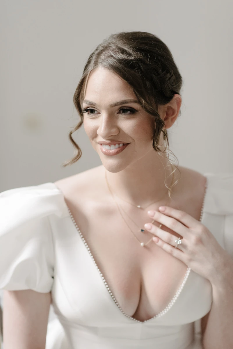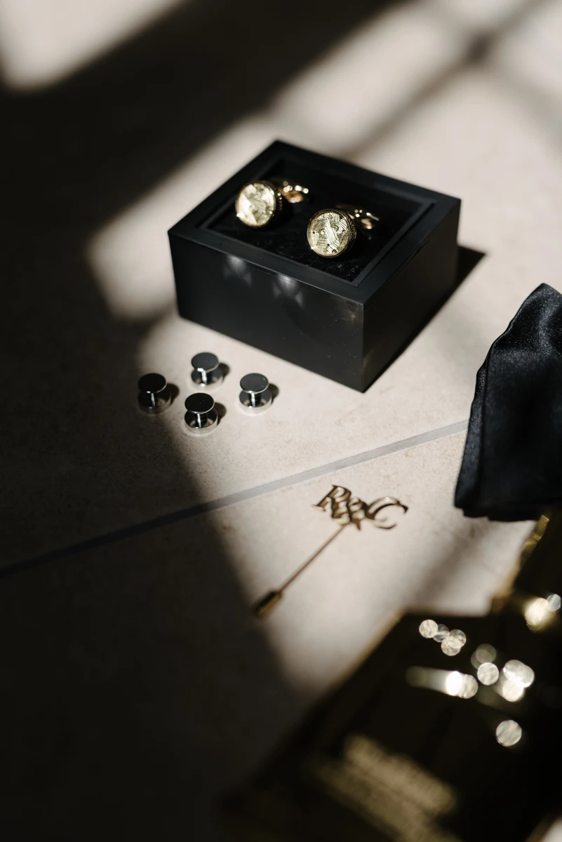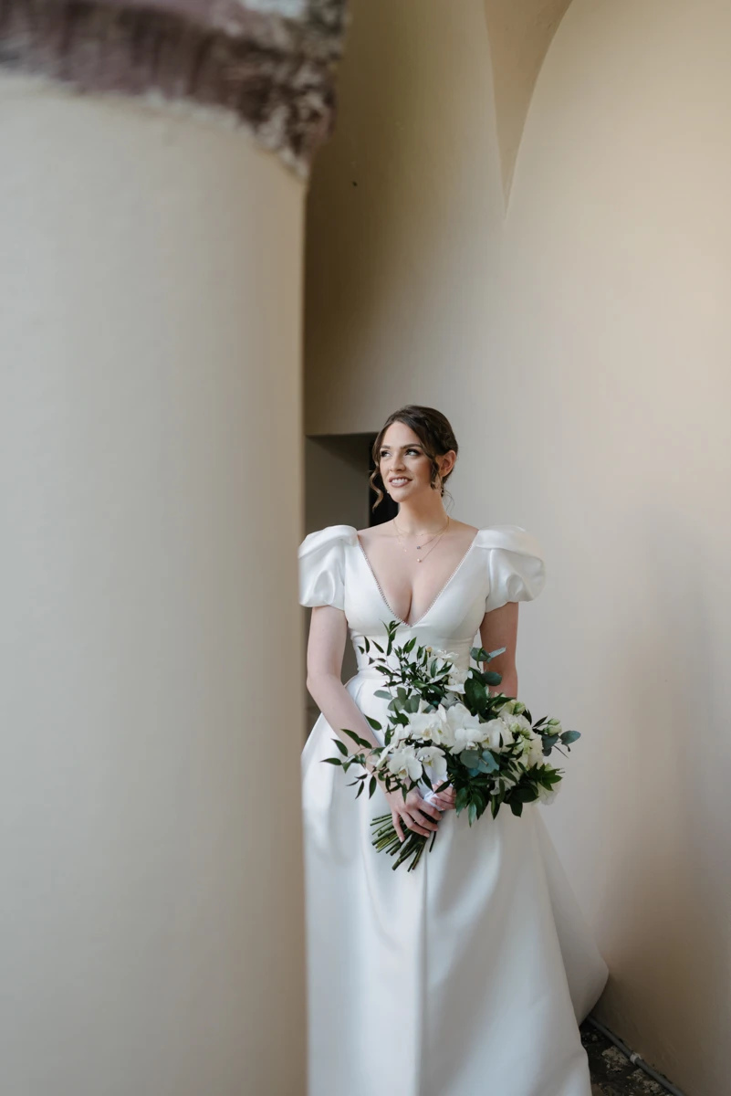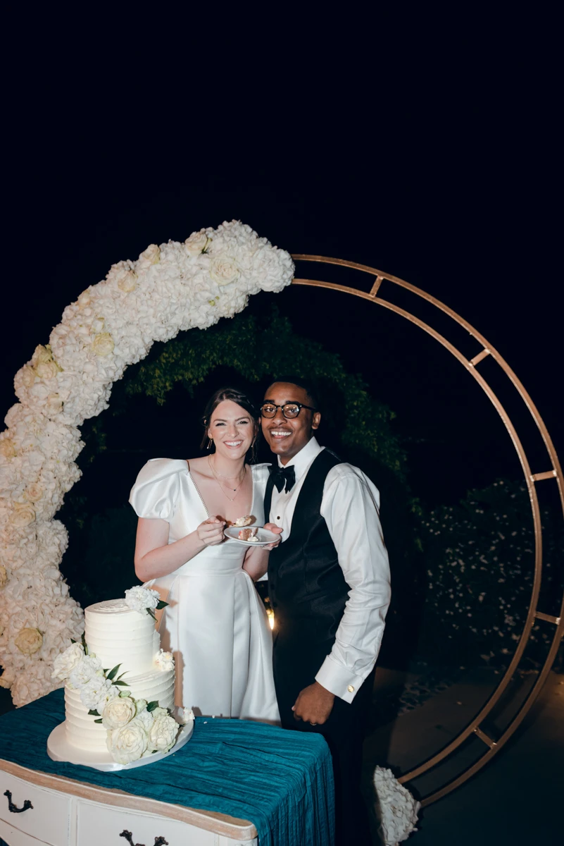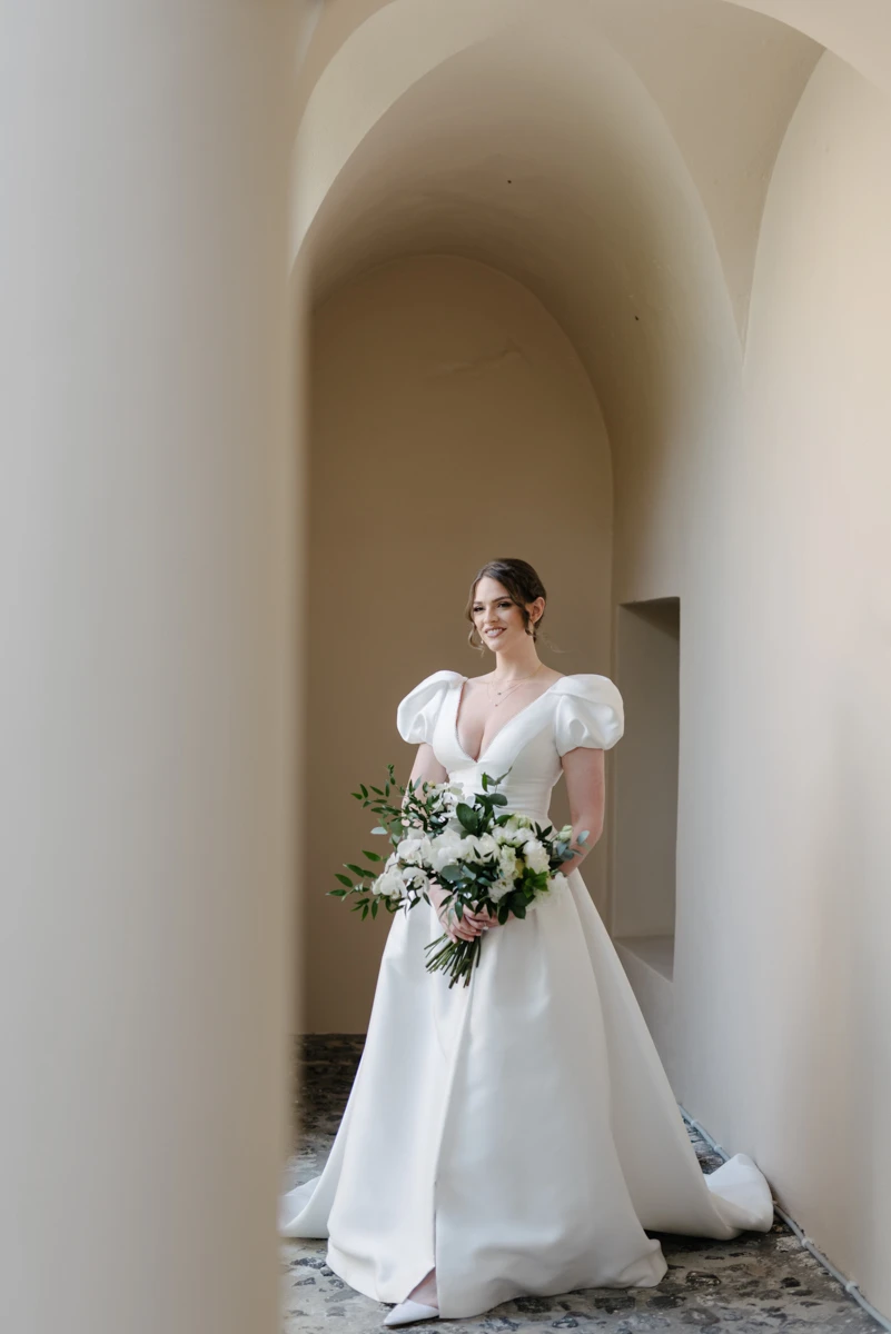 Transforming the dinner space was the day’s biggest challenge. For their intimate group of guests, we created a long table adorned with florals, not only on the tabletop but also suspended above. Gorgeous floral arrangements hung from a gold canopy, while crystal chandeliers provided a soft, romantic glow. The result was a truly magical atmosphere, one that Rachel and Cameron couldn’t have imagined more perfectly.