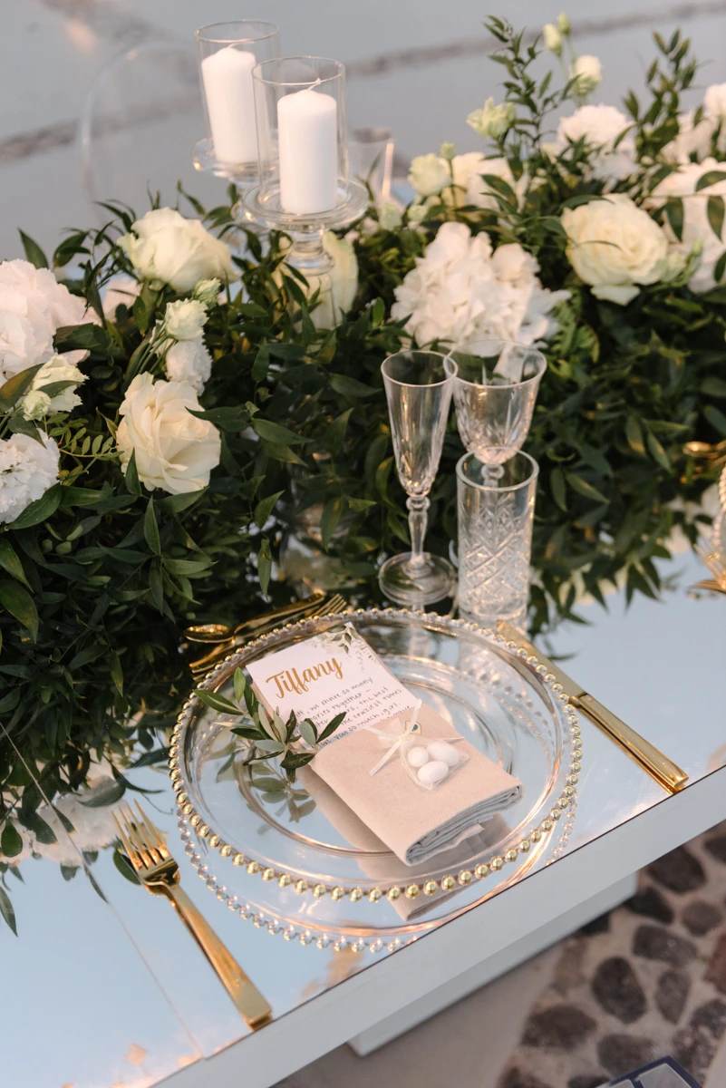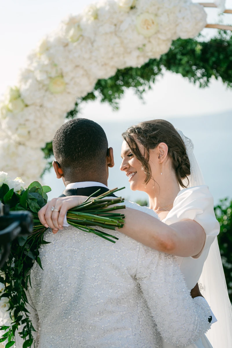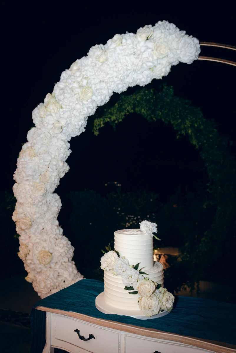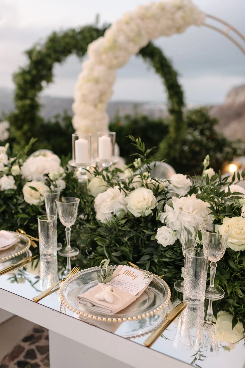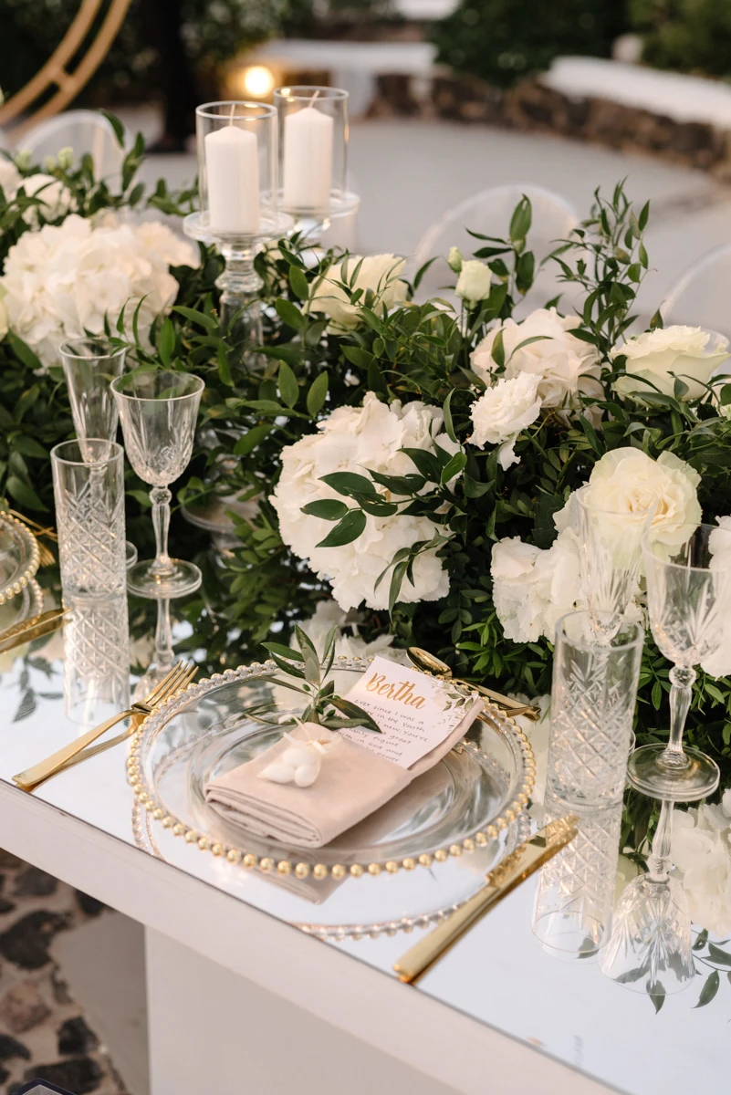 Their special day began with preparations at the beautiful Villa Ioulia, before moving to the stunning Venetsanos Winery for their ceremony, a venue that aligned perfectly with their dream setting. We blended white flowers with lush greenery, carefully designing a backdrop that framed the breathtaking views without overpowering them.