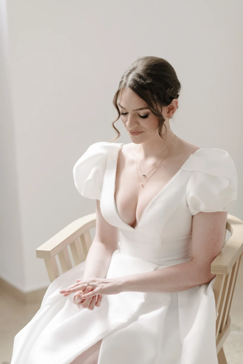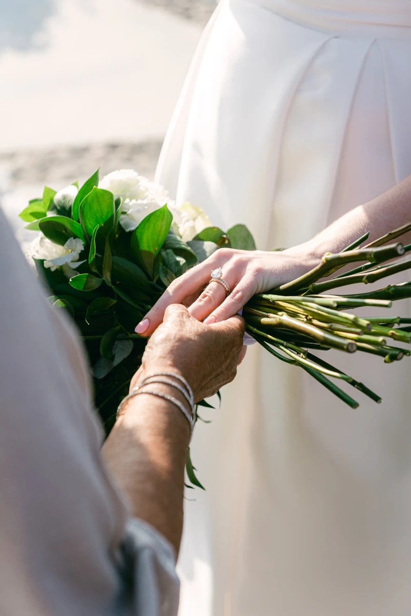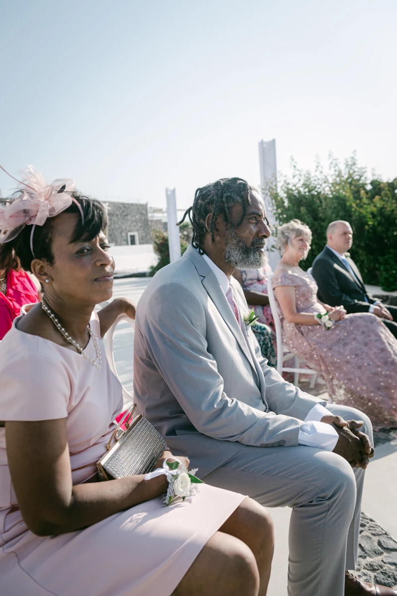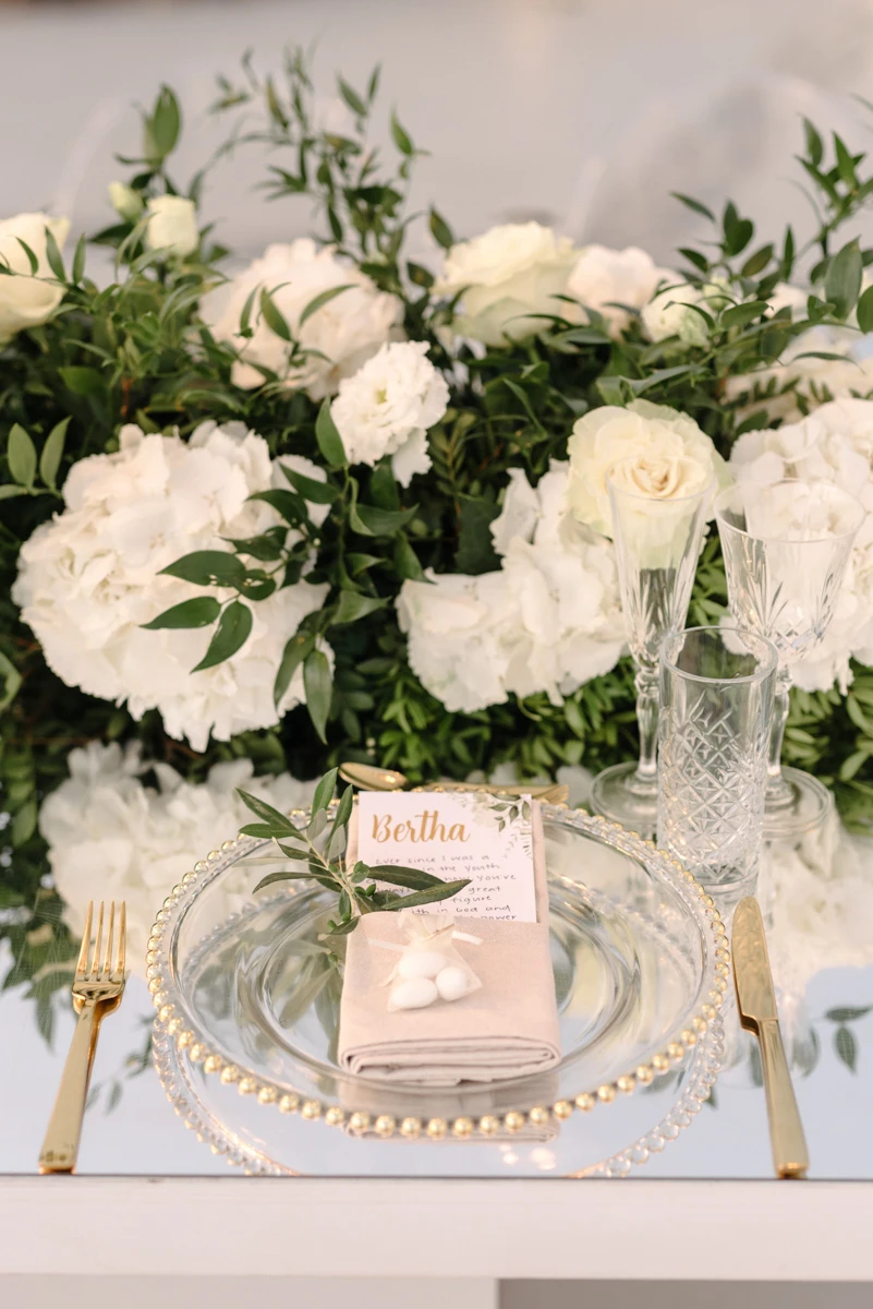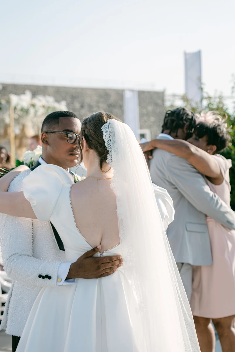 Their special day began with preparations at the beautiful Villa Ioulia, before moving to the stunning Venetsanos Winery for their ceremony, a venue that aligned perfectly with their dream setting. We blended white flowers with lush greenery, carefully designing a backdrop that framed the breathtaking views without overpowering them.